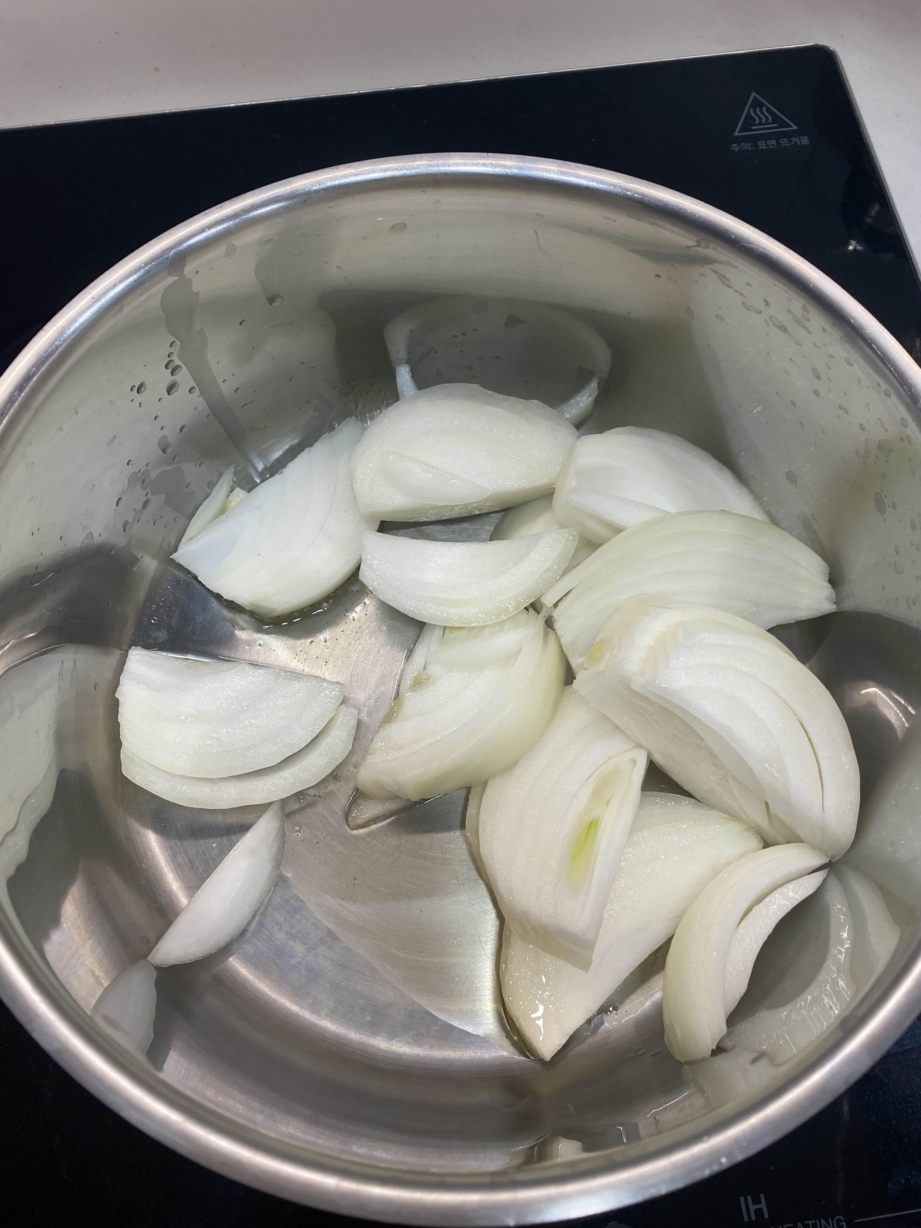 중불에서 현미유를 두른 후 양파를 볶아줍니다